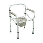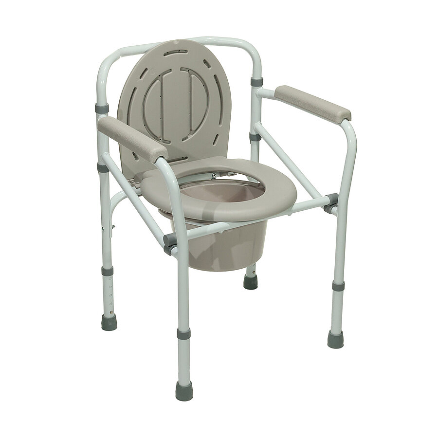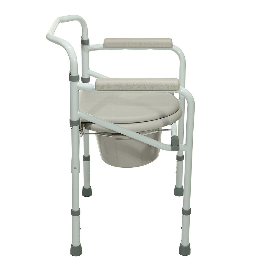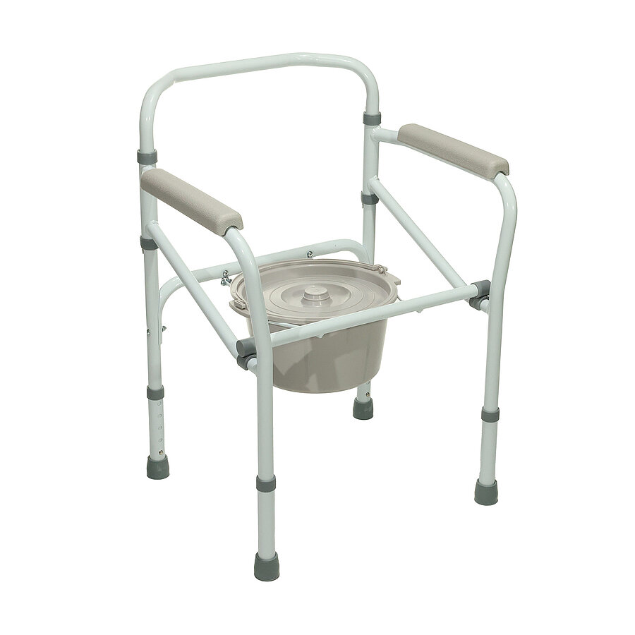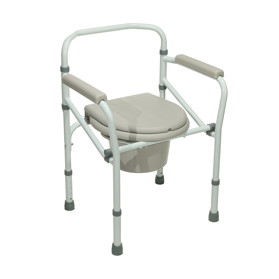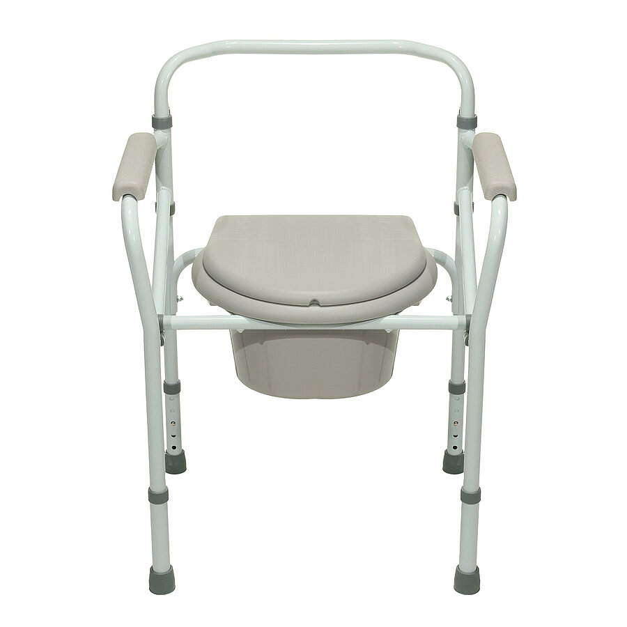 Sturdy foldable commode chair with height-adjustable legs, ergonomic armrests and removable commode bucket for easy cleaning.