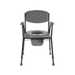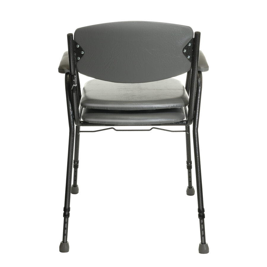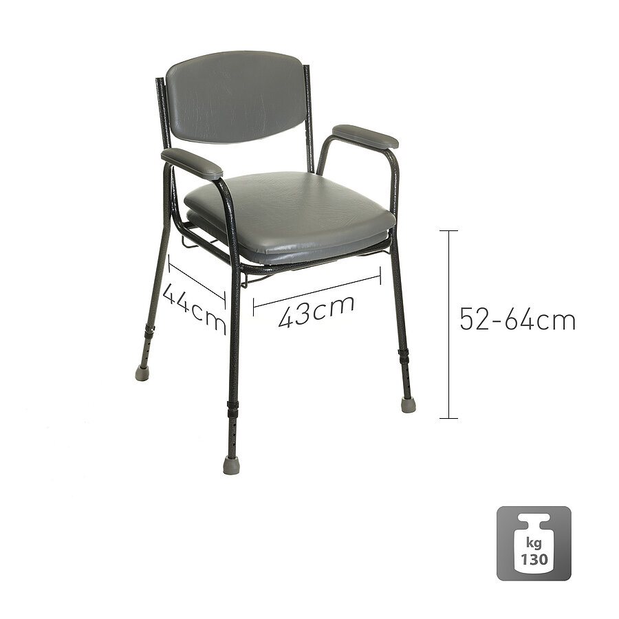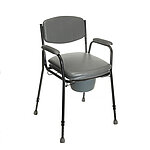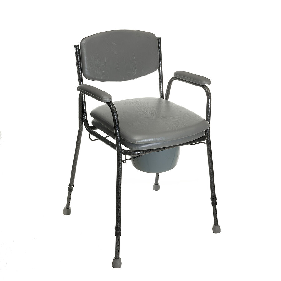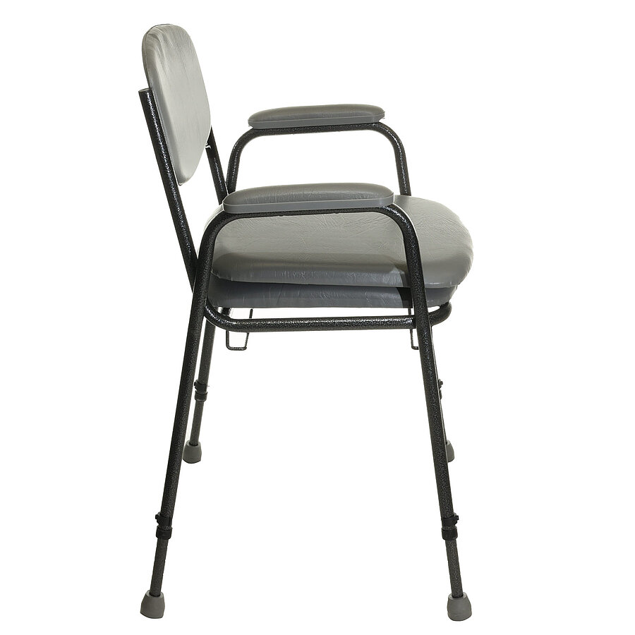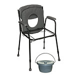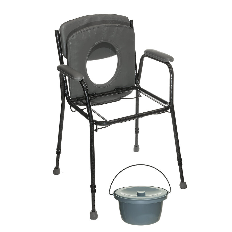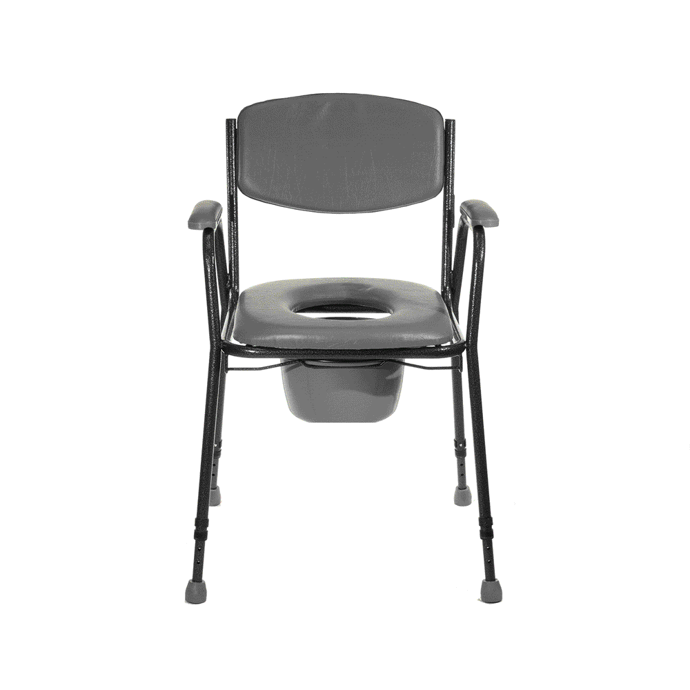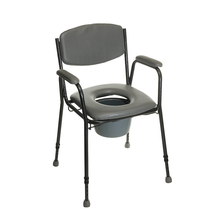 The commode chair features a removable bucket and a removable seat and is suitable as both a bedside commode chair and normal chair. The height of the chair can be adjusted as required thanks to the height-adjustable legs. By adjusting the height, the chair can be conveniently positioned above the toilet, serving as a raised toilet seat.