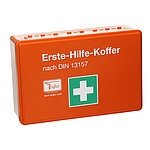The first aid case is optionally available with filling in accordance with DIN 13157 or ÖNORM Z 1020 type 1. Made from impact-resistant, high-vis orange plastic, the type C first aid kit contains all the materials required for an emergency and can be easily wall-mounted using the provided bracket.