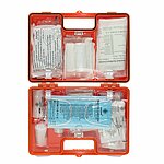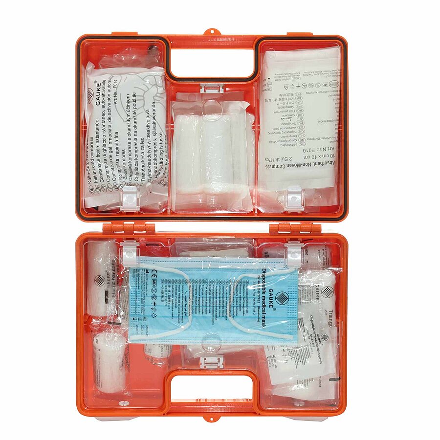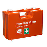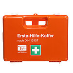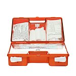 The First Aid Kit DIN 13157 is made of impact-resistant, high-vis orange plastic. It features removable dividers to organise the box as required. Compliant with DIN 13157 standards, this compact first aid kit includes a wall bracket and necessary mounting materials. The twist locks can be opened quickly and easily.