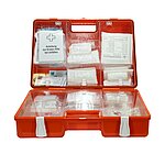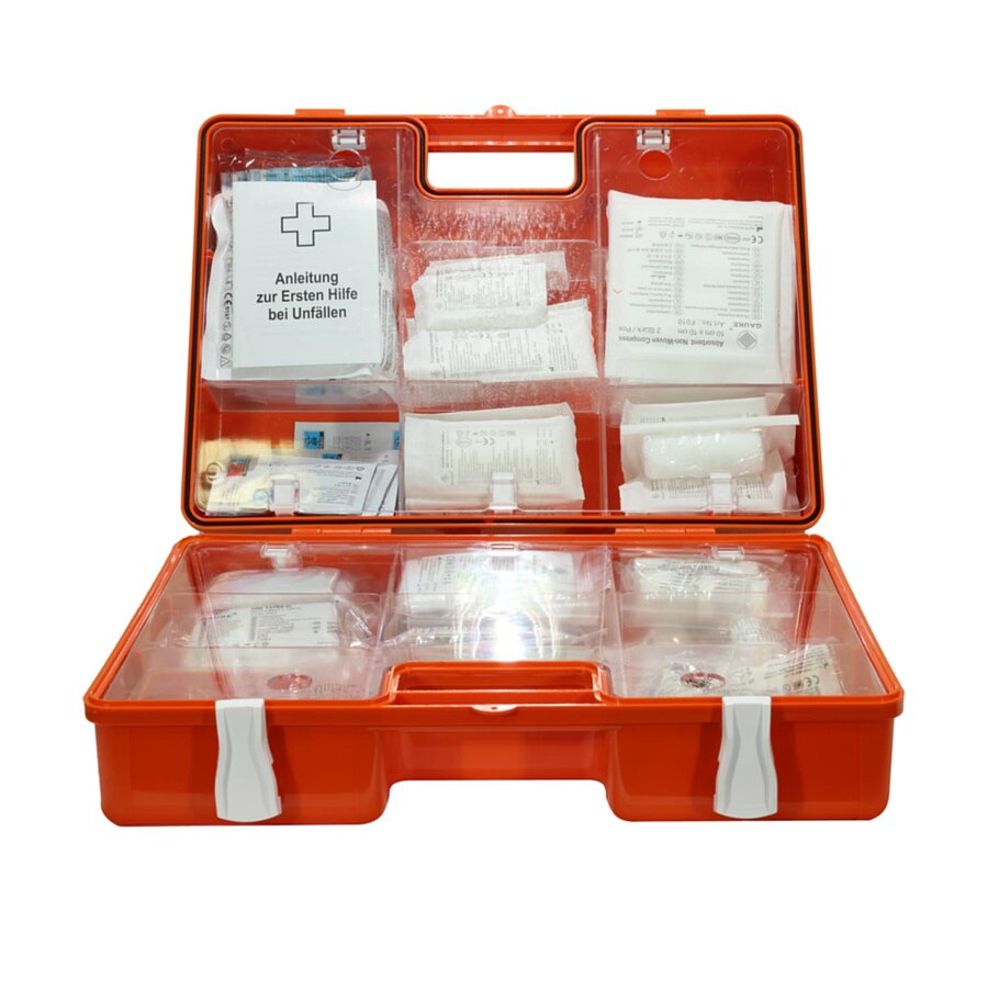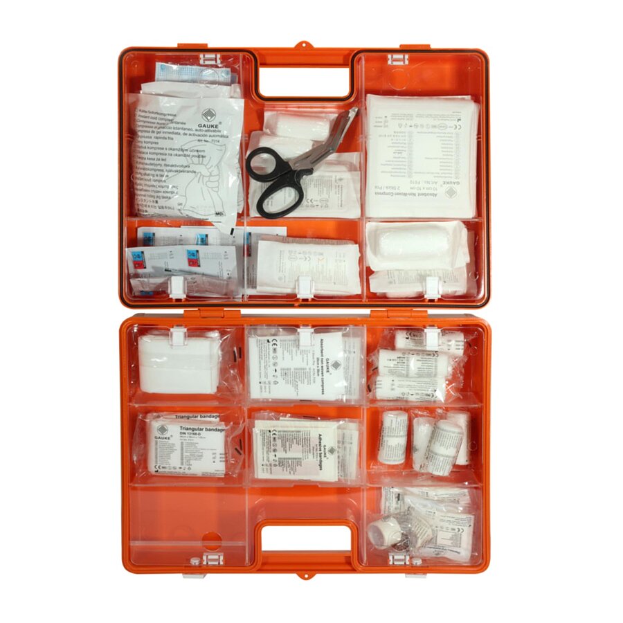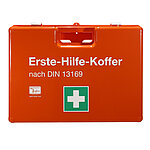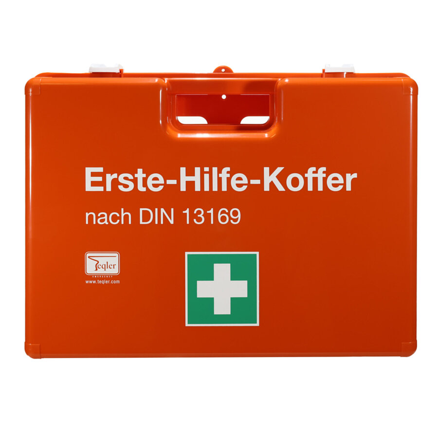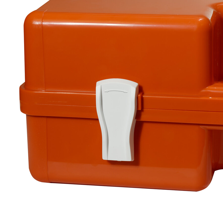 The high-vis orange coloured DIN 13169 first aid kit from Teqler is constructed from durable, impact-resistant and splash-proof ABS plastic. The type E first aid kit is supplied filled in accordance with DIN 13169 and contains ample materials for emergency situations. The interior can be organised flexibly thanks to removable dividers. An easy-to-mount wall bracket is included to place the first aid kit within easy reach.