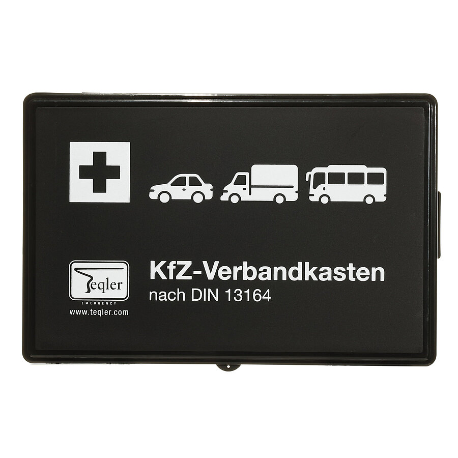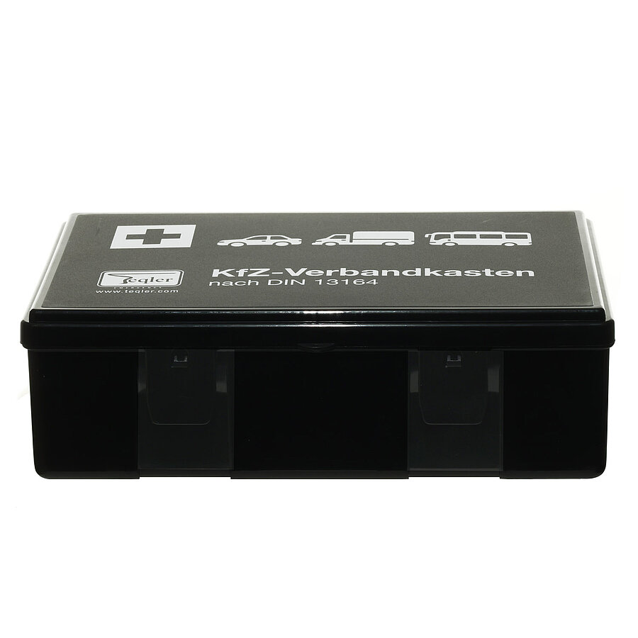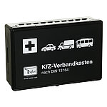 The compact vehicle first aid kit DIN 13164 contains all the first aid items prescribed for road traffic and is made of impact-resistant, black plastic. It is fully filled in accordance with DIN 13164 and is supplied with a bracket and mounting material.