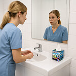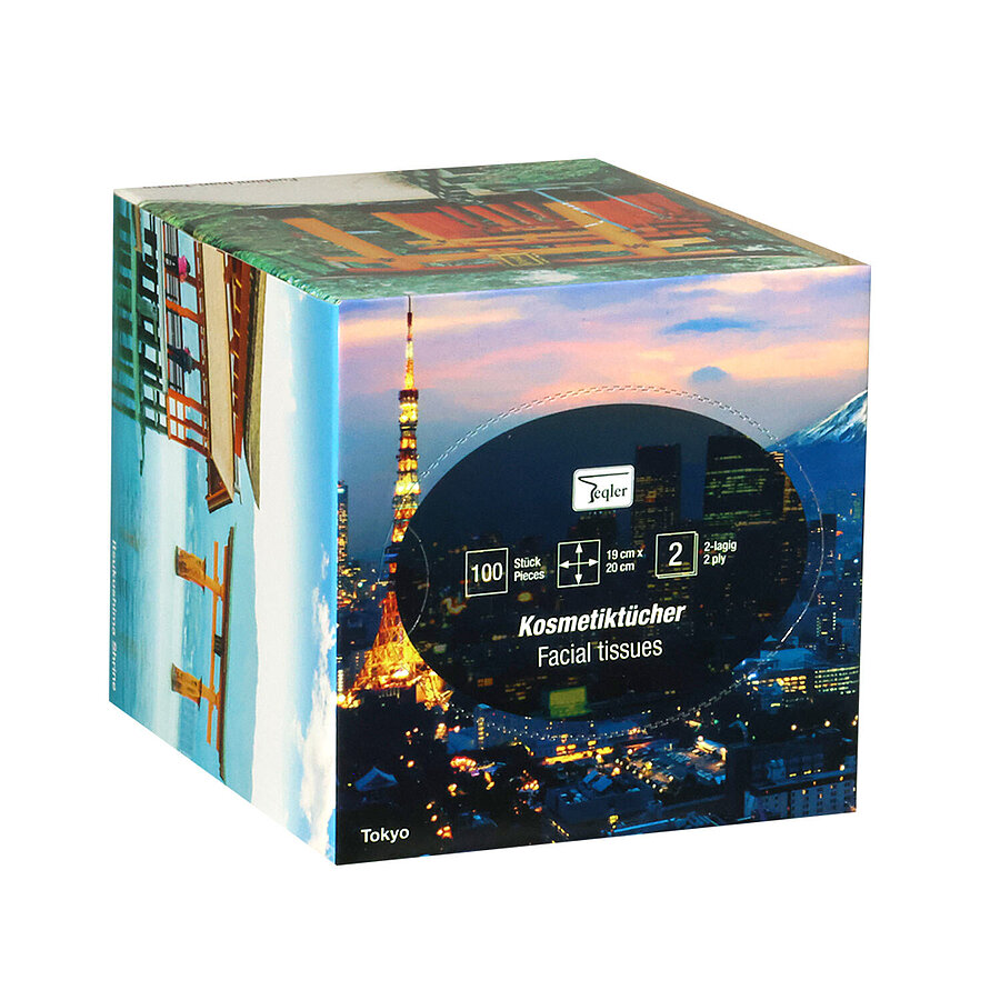 The paper towel box with 2-ply cosmetic tissues made from soft cellulose is equipped with a handy opening for hygienic tissue removal. Every following towel is automatically pulled out after the preceding tissue without needing to be touched. The white towels with a size of 19 x 20cm are delivered in a dispenser box with attractive design.