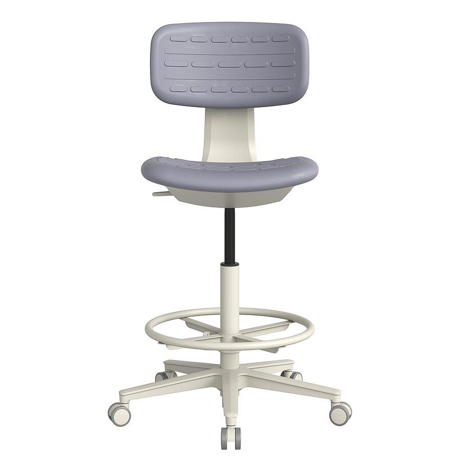 The infinitely adjustable seat height (58–83 cm), controlled via lever or ring release, allows for quick adaptation to various users and workstations. The durable PU seat and backrest are resistant to wear, heat, and disinfectants, ensuring longevity and hygiene. Their non-slip surface provides additional stability during precise or repetitive tasks.