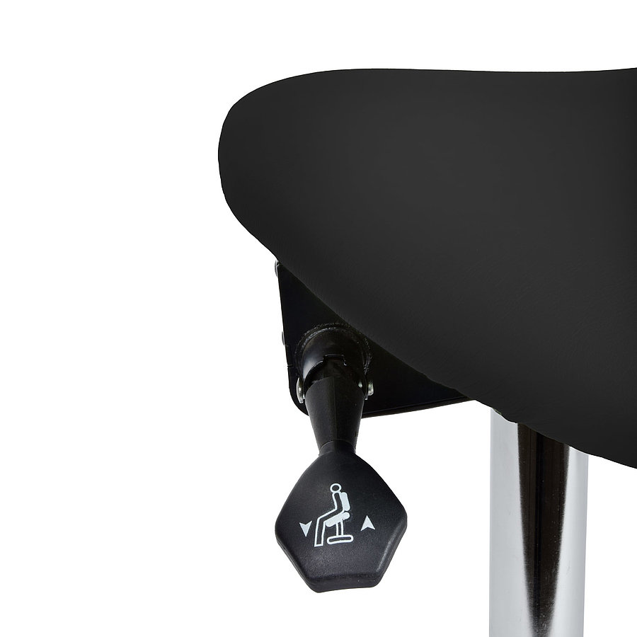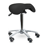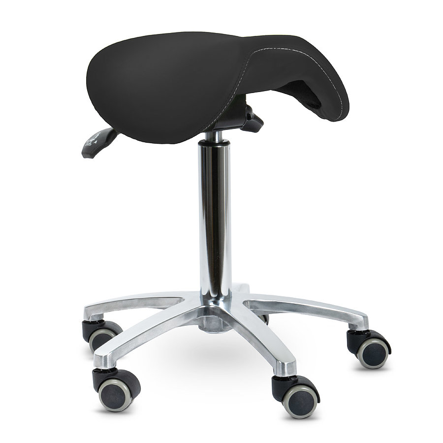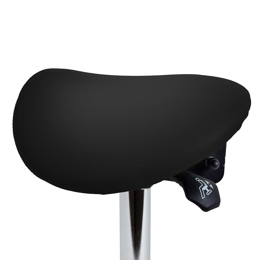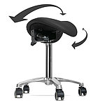 The swivel stool with tiltable saddle seat by Teqler features an ergonomically shaped seat that can be adjusted in angle by means of a tilting mechanism. The stool is adjustable in height between 53 cm and 73 cm.