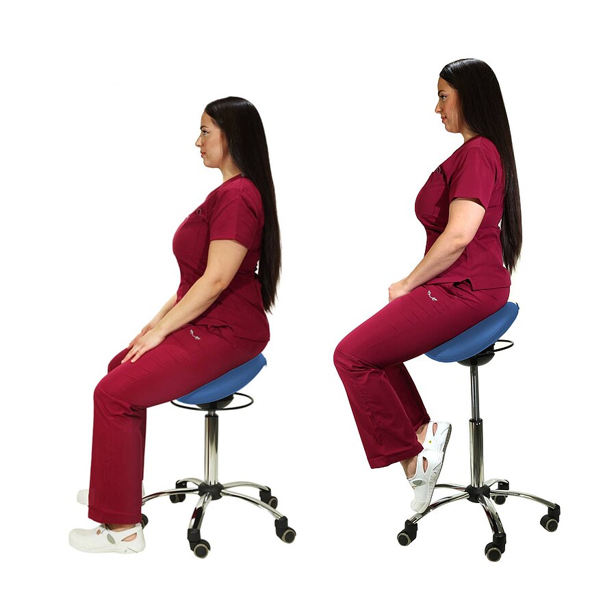 The saddle chair with swing mechanism provides superior seating comfort with its gently curved, softly upholstered seat, making it ideal for diverse healthcare settings. Its easy-care imitation leather cover allows for hygienic cleaning and disinfection. The release ring enables seamless height adjustment, catering to the user's individual height preferences.