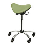 The saddle chair with swing mechanism provides superior seating comfort with its gently curved, softly upholstered seat, making it ideal for diverse healthcare settings. Its easy-care imitation leather cover allows for hygienic cleaning and disinfection. The release ring enables seamless height adjustment, catering to the user's individual height preferences.