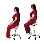 The saddle chair with swing mechanism provides superior seating comfort with its gently curved, softly upholstered seat, making it ideal for diverse healthcare settings. Its easy-care imitation leather cover allows for hygienic cleaning and disinfection. The release ring enables seamless height adjustment, catering to the user's individual height preferences.