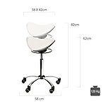 The saddle chair with swing mechanism provides superior seating comfort with its gently curved, softly upholstered seat, making it ideal for diverse healthcare settings. Its easy-care imitation leather cover allows for hygienic cleaning and disinfection. The release ring enables seamless height adjustment, catering to the user's individual height preferences.