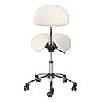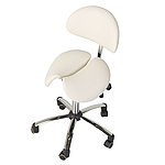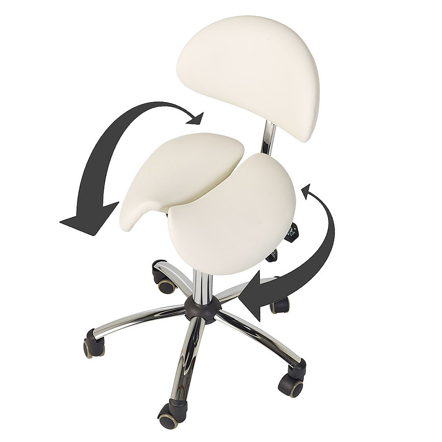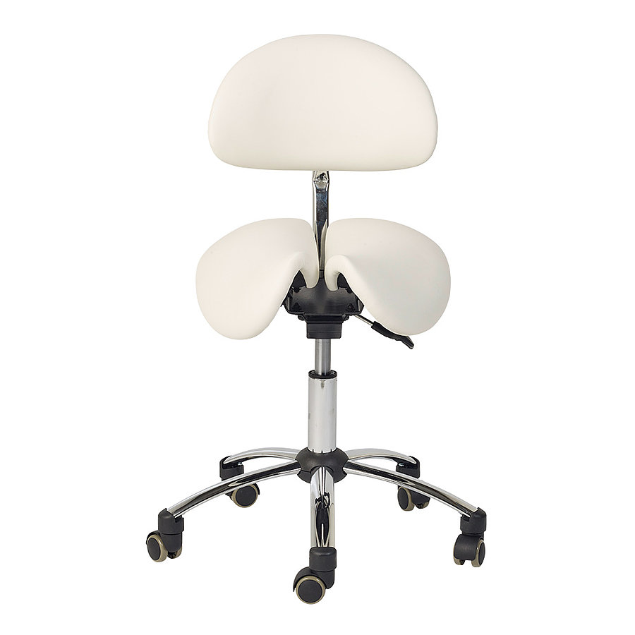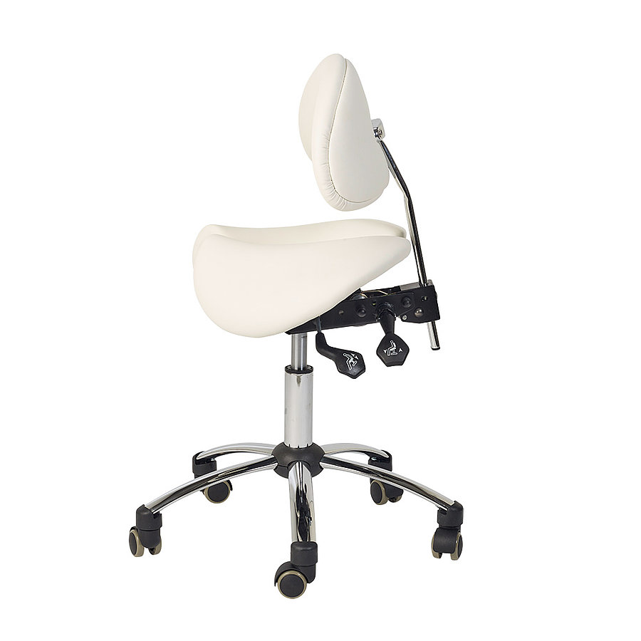 The Teqler saddle stool features an upholstered backrest. Its saddle shape allows for a healthy posture and helps prevent back problems.
