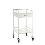 This robust, stainless-steel multipurpose trolley can be used as a device trolley for medical equipment or as a storage trolley for injection procedures or when changing dressings. Depending on the requirement, this stainless-steel multipurpose trolley can be ordered with up to 3 drawers. The four, smooth-rolling castors provide this disinfectant-tolerant medical trolley with portability.