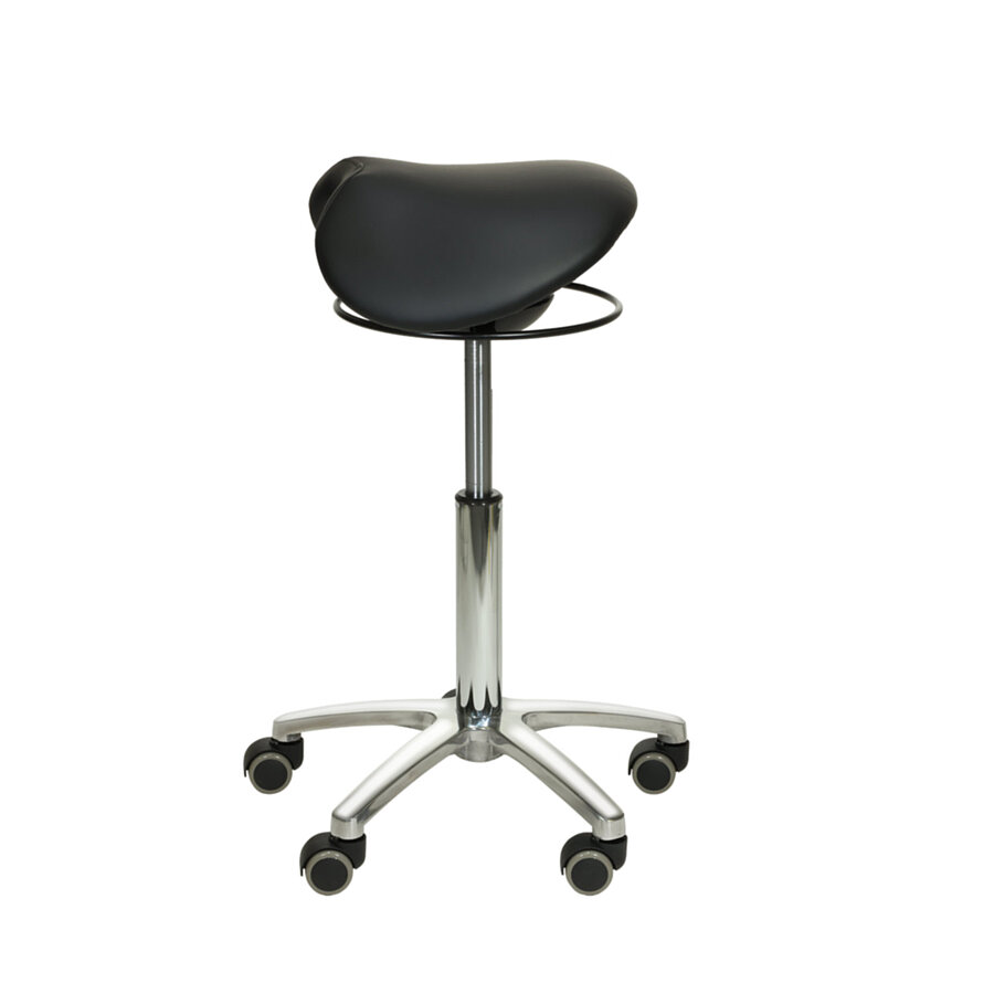 Thanks to its swing mechanism, the saddle stool from Teqler encourages an active sitting posture. The rolling saddle stool with ergonomic, undivided seat features continuous height adjustment via a black release ring. The soft upholstery, covered in easy-care imitation leather, adds to the overall comfort. With 5 smooth-running double castors designed for hard floors, this stool offers flexibility for use in medical practices.