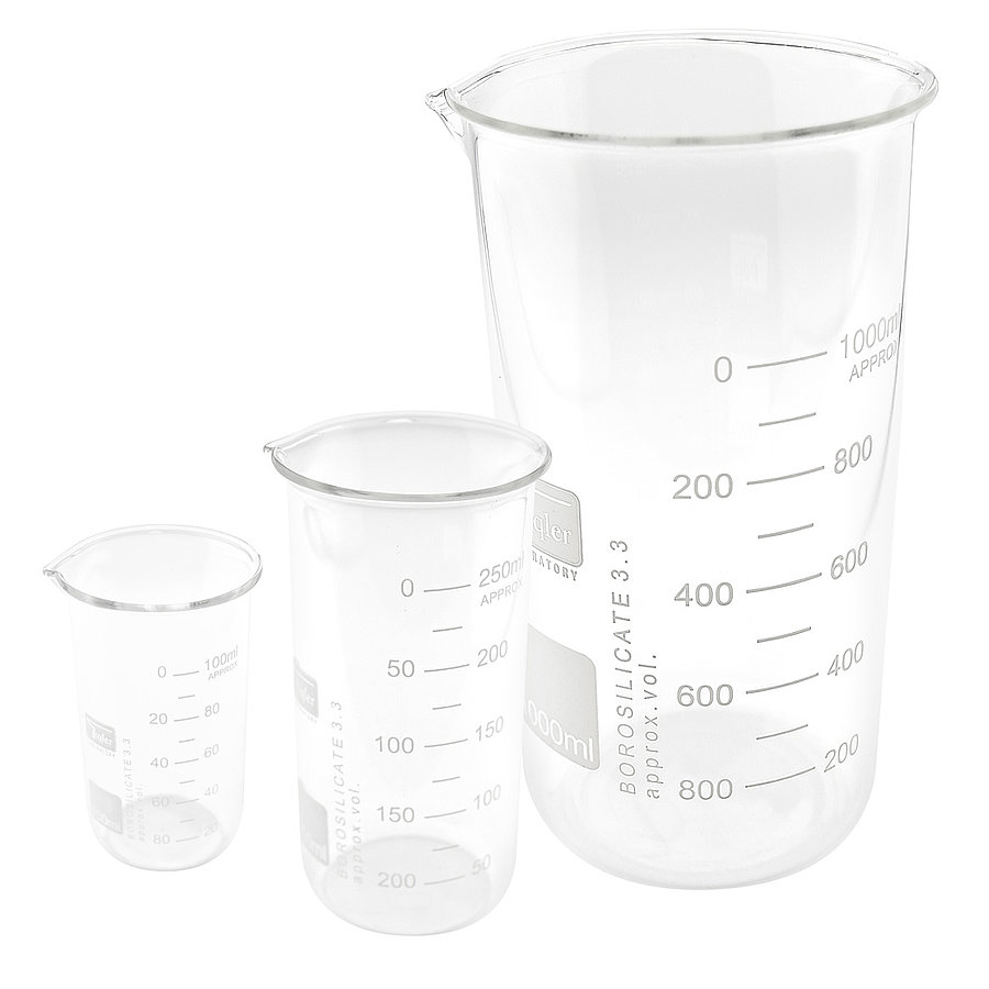 Temperature and chemical tolerant glass beaker with detailed, easy-to-read scale. With spout for easily exchanging liquids. This glass beaker is available in three sizes.