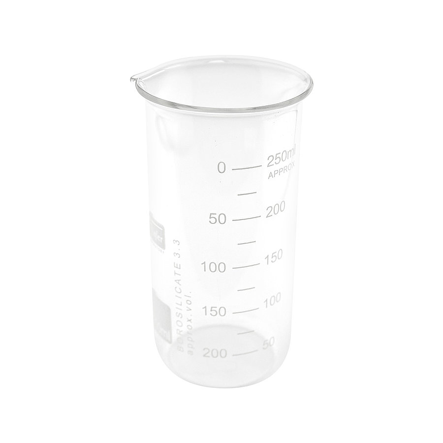 Temperature and chemical tolerant glass beaker with detailed, easy-to-read scale. With spout for easily exchanging liquids. This glass beaker is available in three sizes.
