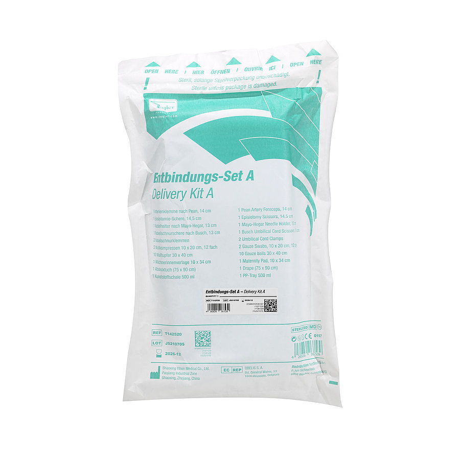 The delivery set A consists of a multi-part instrument set and hygienic consumables for delivery. The ready-to-use set is CE-certified, sterilely packaged and of high quality. Since the set is a hygienic disposable product, all components are disposed of after use. There is no need for time-consuming reprocessing and the risk of spreading germs or infections is minimised.
