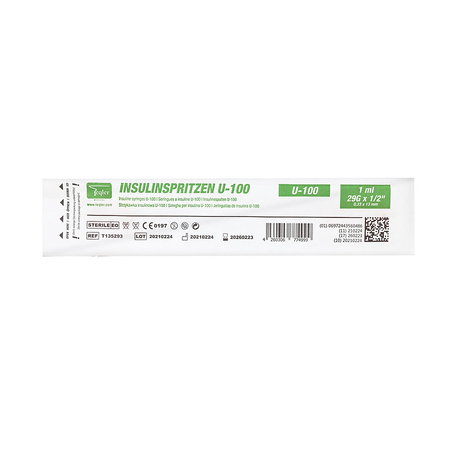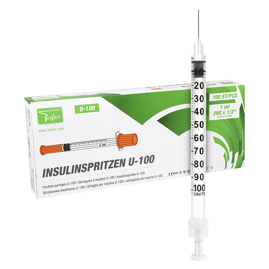 The single-use insulin syringe by Teqler is available in U-40 and U-100 insulin concentrations.