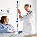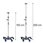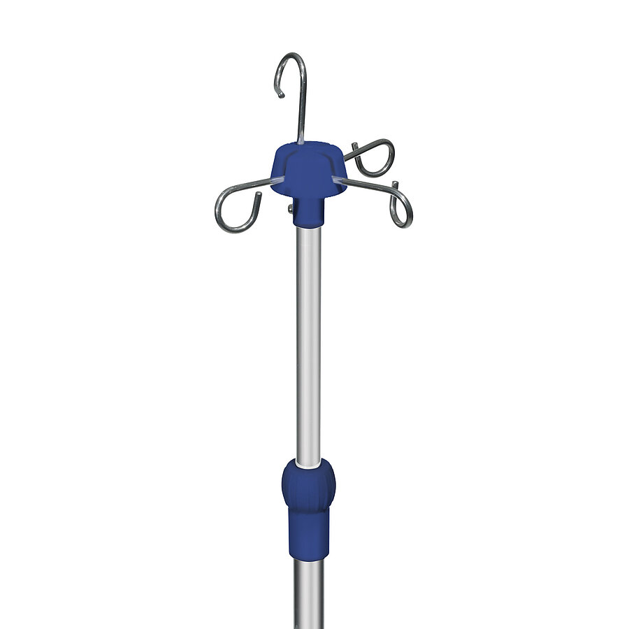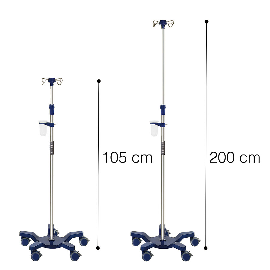 The Teqler Premium IV Stand offers adjustable height from 105 to 200 cm, a stable crossbar with four loop-shaped hooks, and a robust 5-leg base – suitable for everyday use in clinics and medical practices.