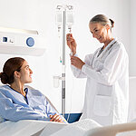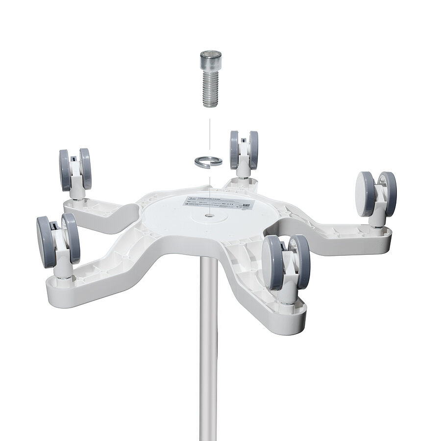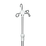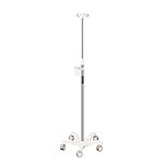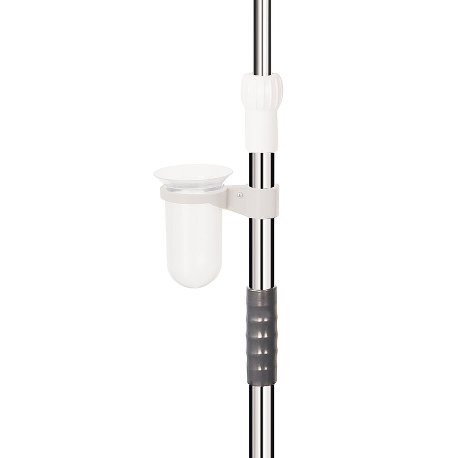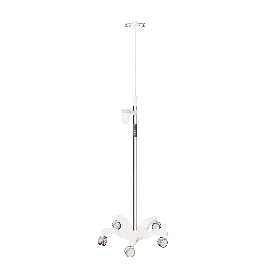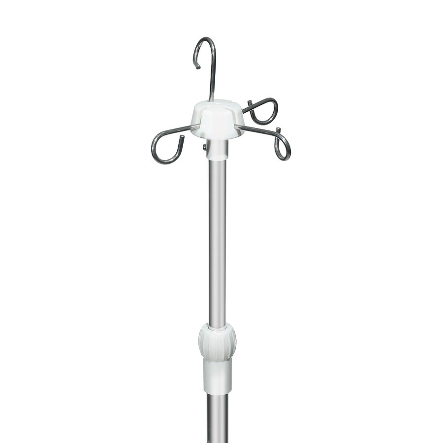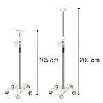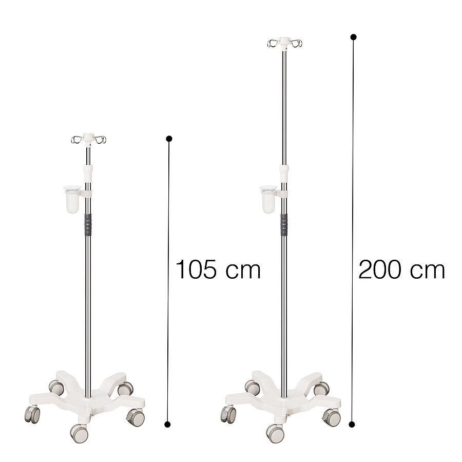The stainless steel IV stand is perfect for use in hospitals, care facilities and medical practices. The height adjusts from 105 to 200 cm, while the five-leg base with smooth double castors, two lockable, ensures stability and mobility. Equipped with four durable hooks, it can hold multiple infusion bottles or bags simultaneously. A convenient plastic container with a holder offers extra storage space.