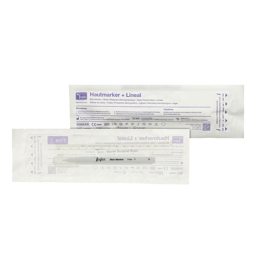 These sterile skin markers w/ruler are ideal for marking the skin before surgical procedures. The ink is long-lasting, abrasion-resistant and both non- allergenic and non-irritating. It can be easily removed with disinfectant containing chlorhexidine. The ruler is sterile and can be used to measure areas such as nevi or similar skin changes.