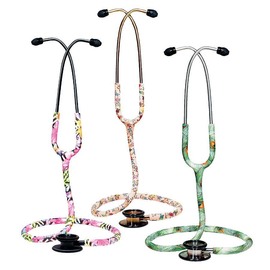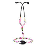 Stethoscope "exclusive edition" with combination chest-piece and color-printed tube. The chestpiece consists of diaphragm and funnel and is suitable for auscultation of all frequency ranges in adults and children. The earpieces can be adjusted to the user's needs. The interchangeable soft earpieces provide an optimal acoustic seal and pleasant wearing comfort.
