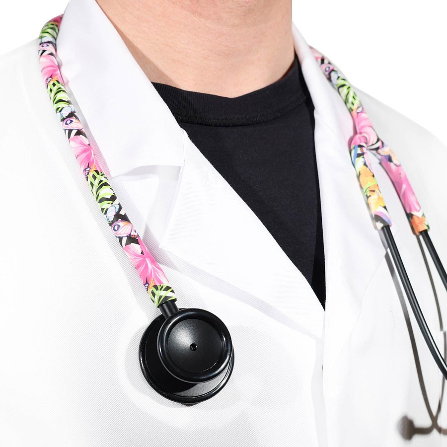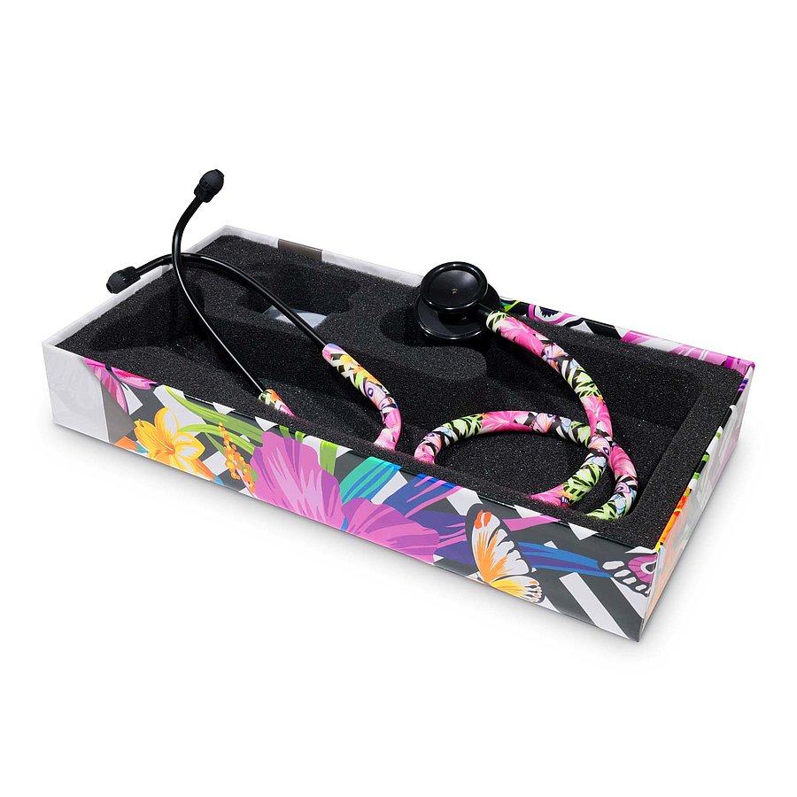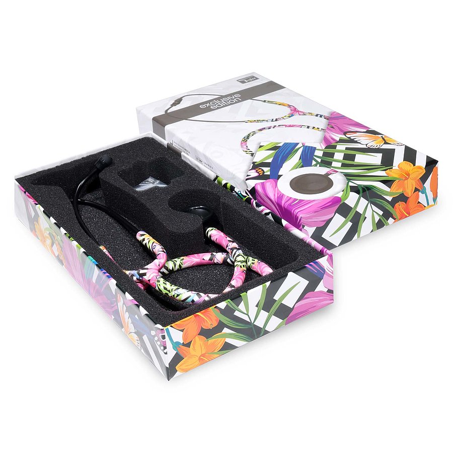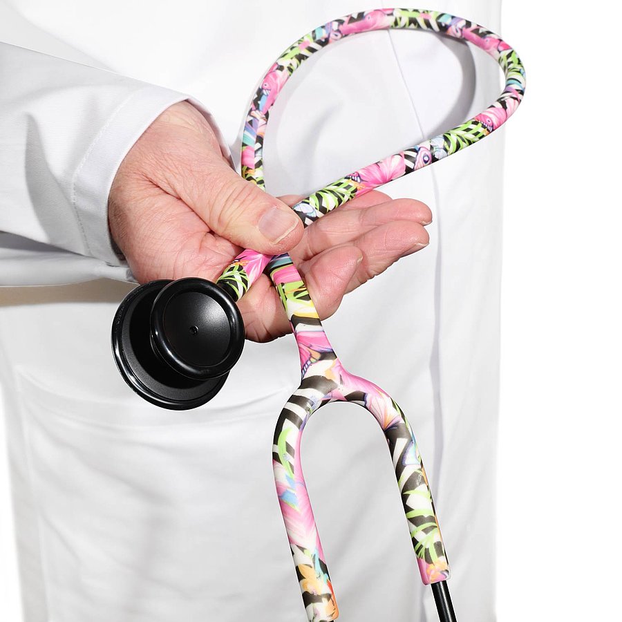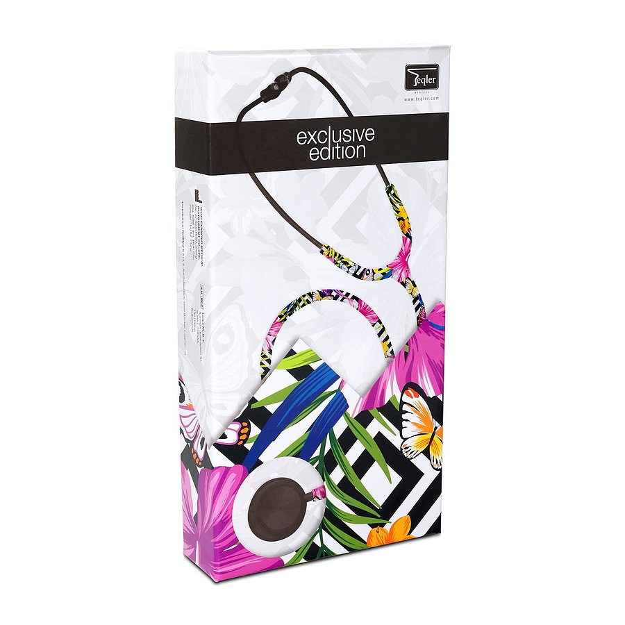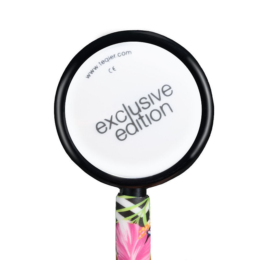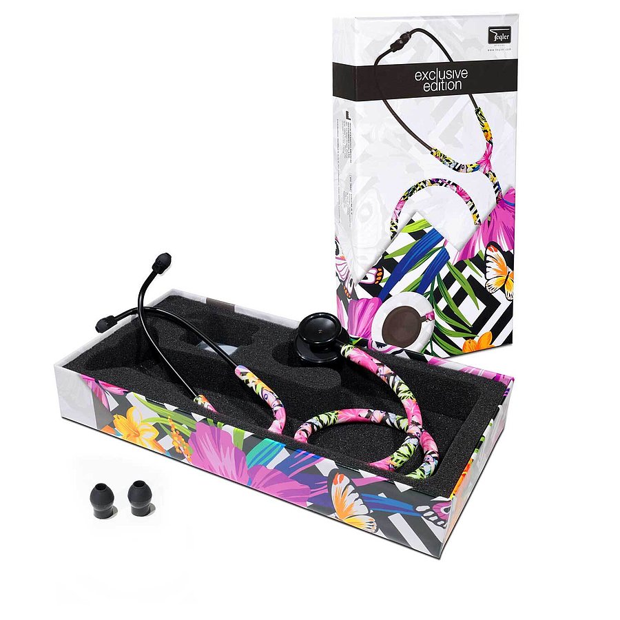 Stethoscope "exclusive edition" with combination chest-piece and color-printed tube. The chestpiece consists of diaphragm and funnel and is suitable for auscultation of all frequency ranges in adults and children. The earpieces can be adjusted to the user's needs. The interchangeable soft earpieces provide an optimal acoustic seal and comfortable wearing.