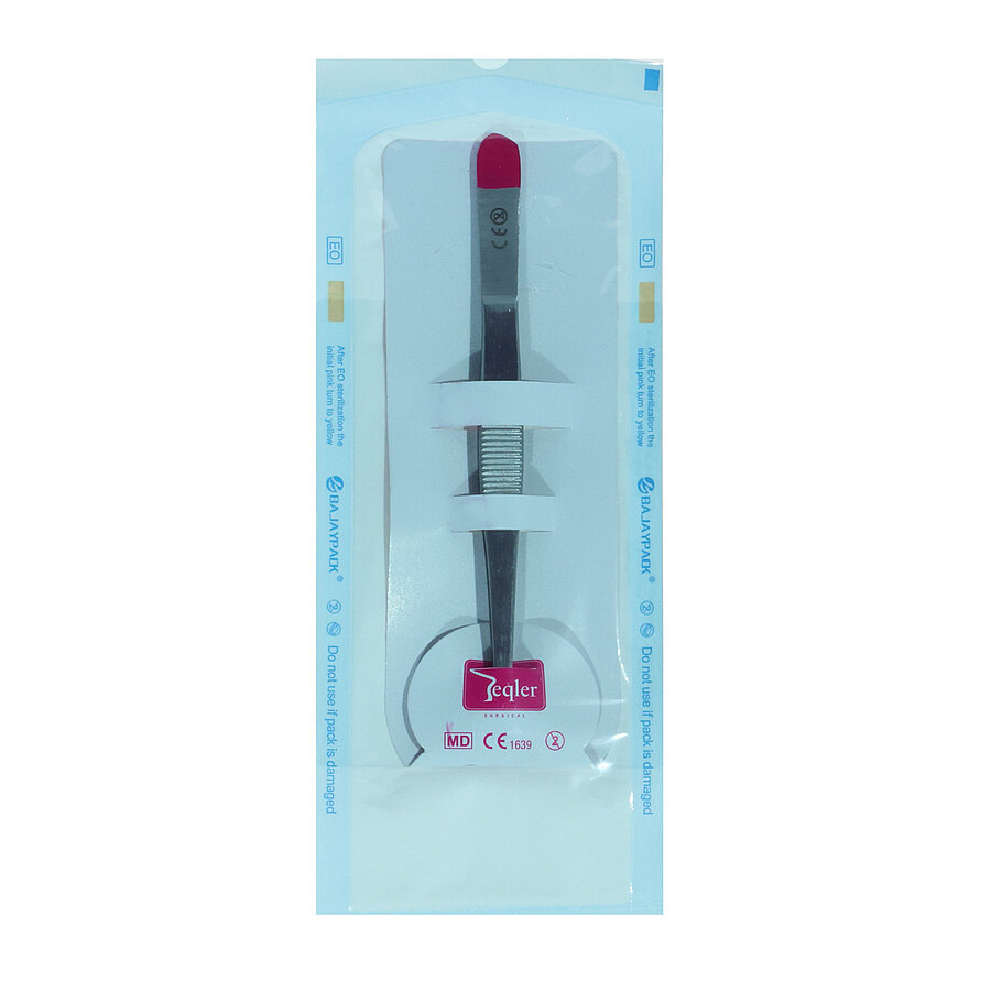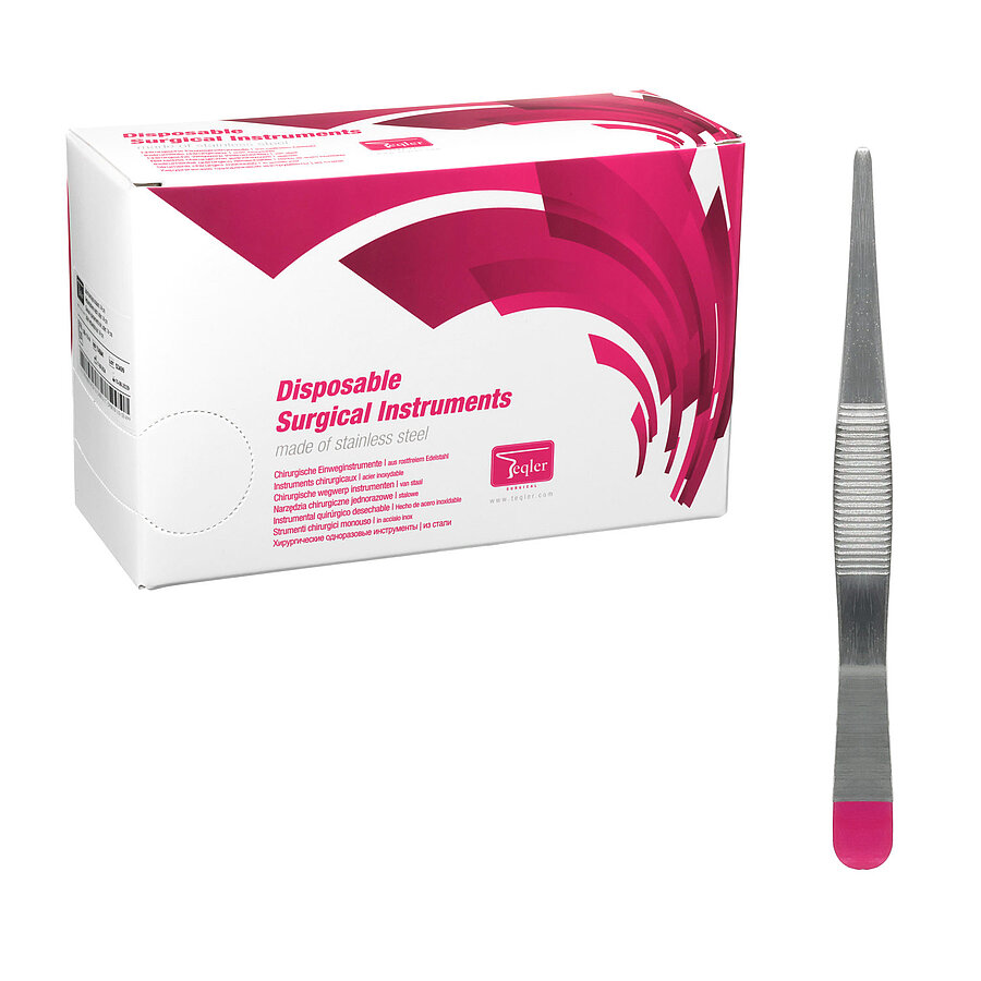 The anatomical forceps (13 cm) are a high-quality disposable instrument made of stainless steel with a brushed, matt surface that prevents reflections for glare-free use. Ideal for grasping and stabilising delicate tissue, they are clearly labelled as single-use to prevent mix-ups with reusable instruments.