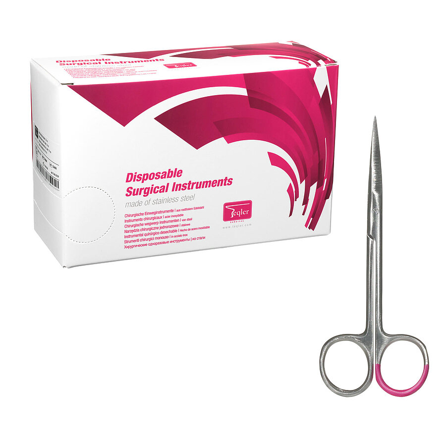 The high-quality iris scissors (11 cm) are hygienic disposable instruments designed for the operating theatre. Their matt, non-reflective surface ensures glare-free, precise handling. Clear single-use labelling reduces the risk of mix-ups and cross-contamination.