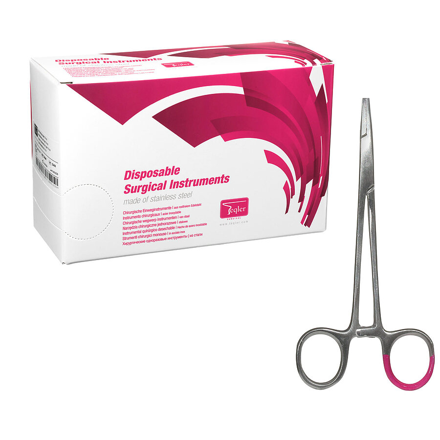 The Mayo Hegar needle holder is a high-quality, single-use instrument made of durable stainless steel. Its brushed, matt surface prevents reflections and ensures glare-free work in the operating theatre. Clearly labelled as sterile and disposable, it avoids confusion with reusable instruments.