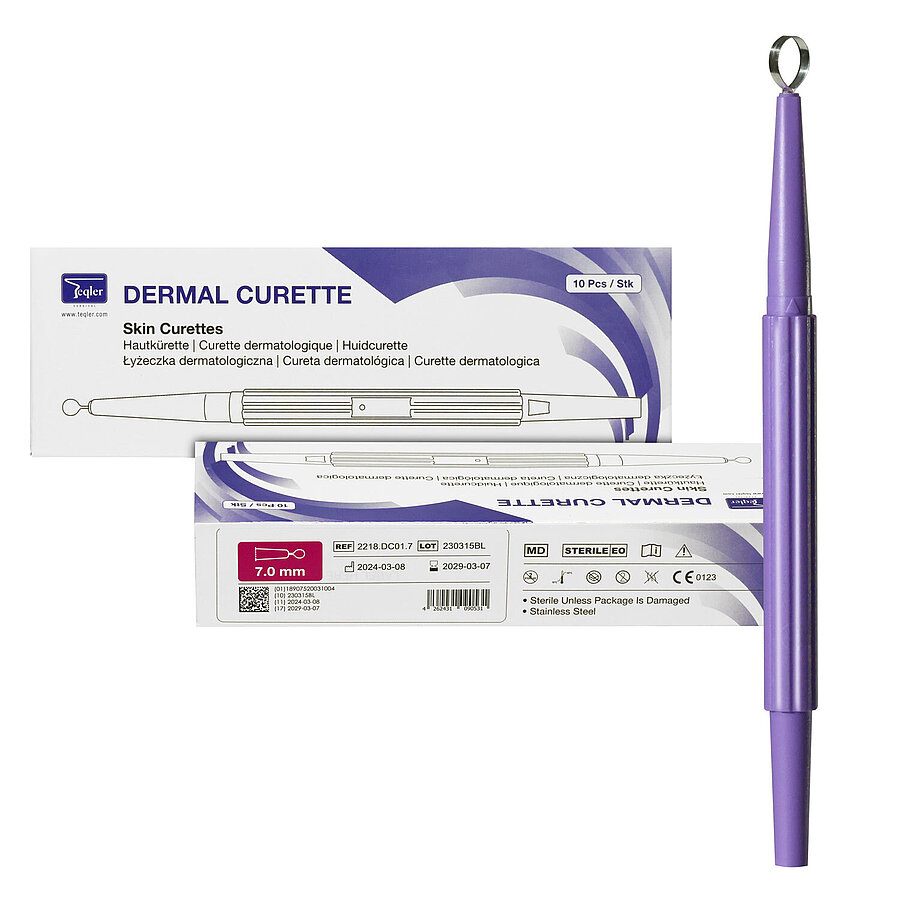 The sterile skin curettes for hygienic single use are ideal for clean and gentle curettage. Their sharp, ring-shaped stainless steel cutting edge ensures precise results and minimises the risk of injury.