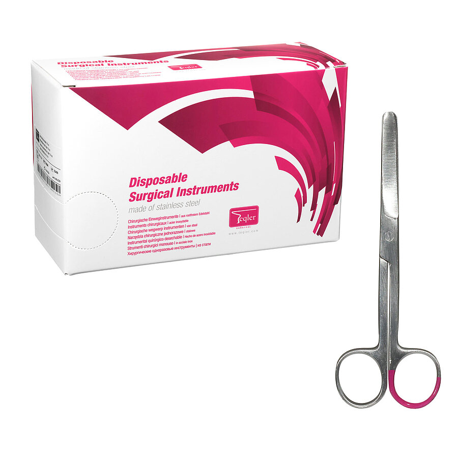 The disposable scissors come in blunt-blunt, blunt-pointed and pointed-pointed configurations to suit different needs. The scissors can be safely disposed of in a sharps container and include stickers for secure documentation, streamlining workflows. Individually sterile-packed, they are mounted on a hygienic backing card and come in a dispenser box of 25 pieces.
