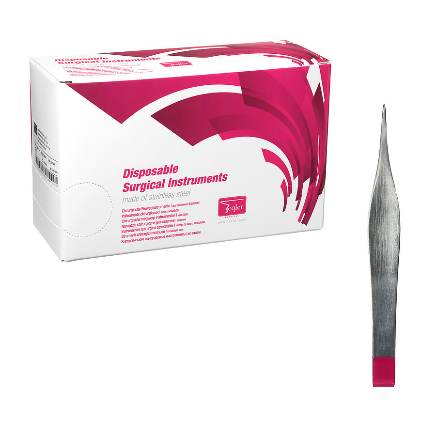 The forceps are clearly labelled as single-use, preventing mix-ups with reusable instruments. Their single-use design reduces the risk of cross-contamination. Mounted on a backing card and individually packaged with a documentation label, they are ready for immediate use. Cost-effective and resource-saving, they are supplied in a dispenser box containing 25 forceps, each with a sterile shelf life of 3 years.