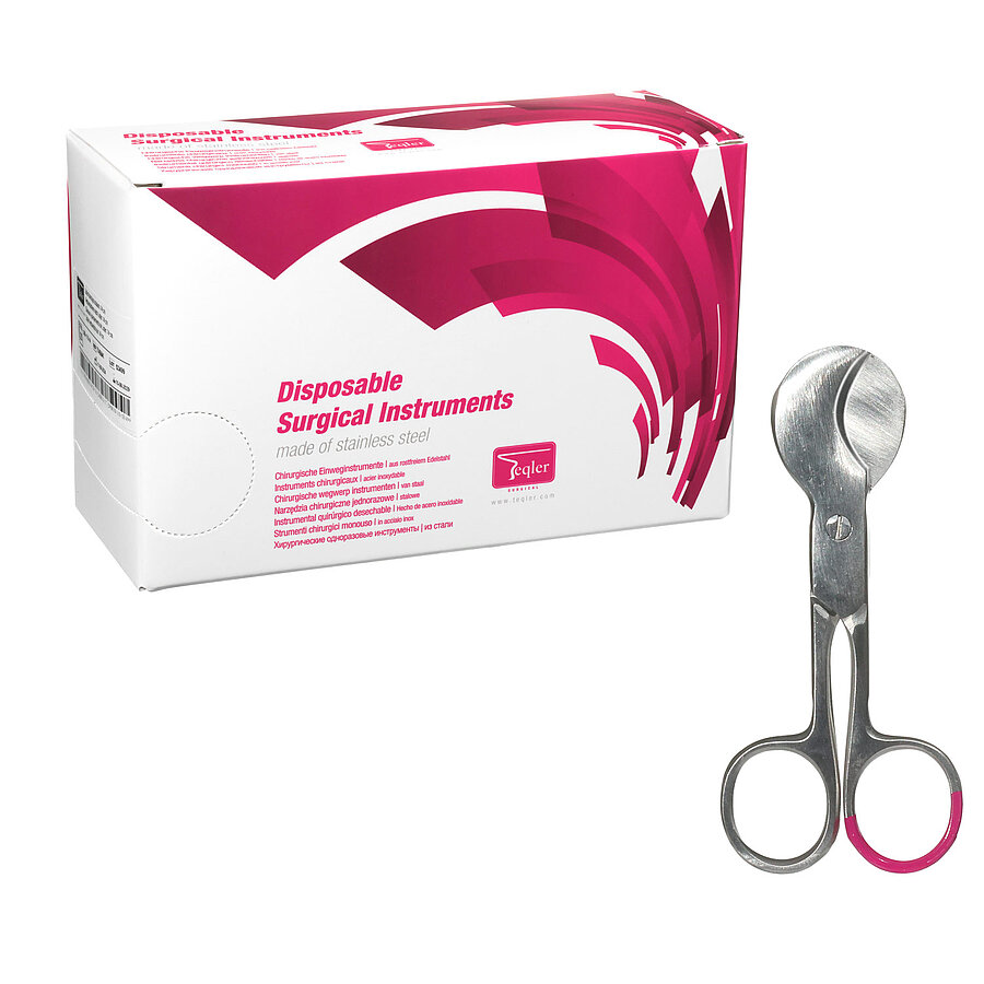 The umbilical cord scissors (10 cm) are a high-quality disposable instrument made of stainless steel. Their matt surface reduces reflections and ensures glare-free operation in the operating theatre. Clearly labelled as sterile single-use instruments, they prevent mix-ups with reusable instruments and minimise the risk of cross-contamination.