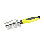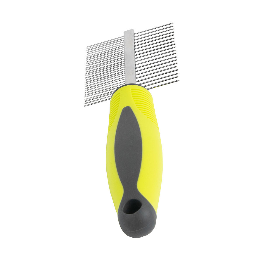 The double-sided care comb unravels and cares for both long and short as well as thick and fine coats, thanks to the two sides with different toothing. Depending on the type of fur, either the side with the middle tines (about 1 mm tine spacing) or the side with the coarse tines (about 2 mm tine spacing) can be used. The metal tines are of course rounded and thus very gentle on the skin. Even for the user, the use is comfortable, the rubber handle of the comb is both ergonomically shaped and grooved.